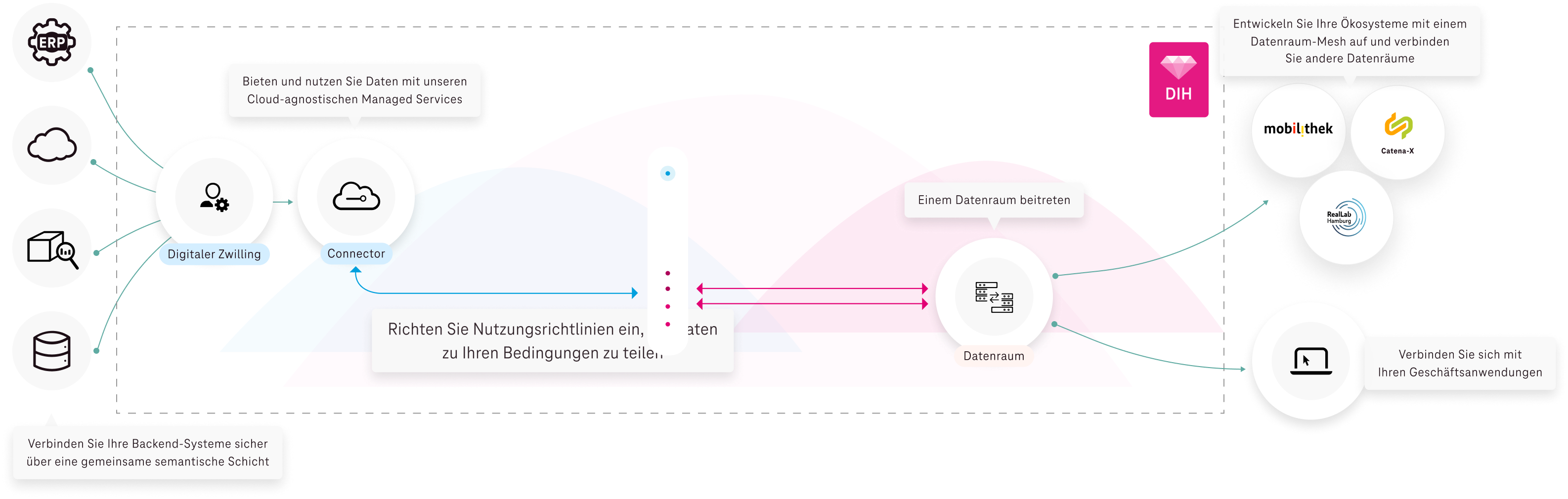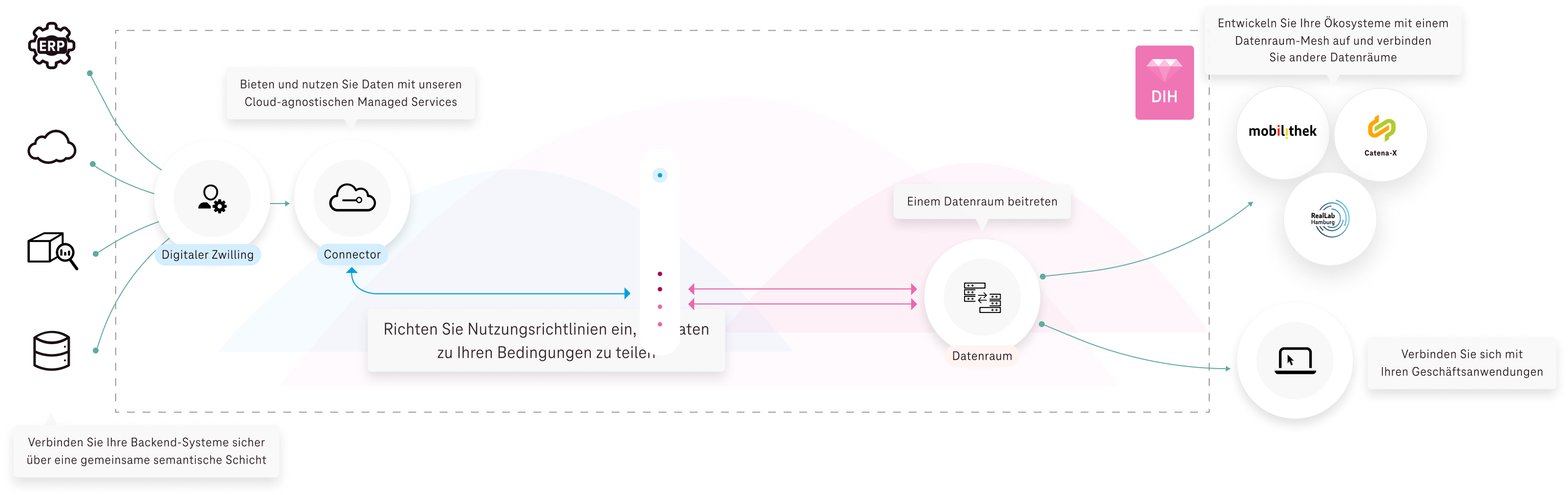 Alle Vorteile gemeinsamer Datenökosysteme auf Knopfdruck. Schließen Sie sich Deutschlands führenden Datenräumen wie Catena-X, GAIA-X, Mobilithek und vielen anderen an, und zwar über unsere Plug and Play- und Cloud-unabhängigen Services.