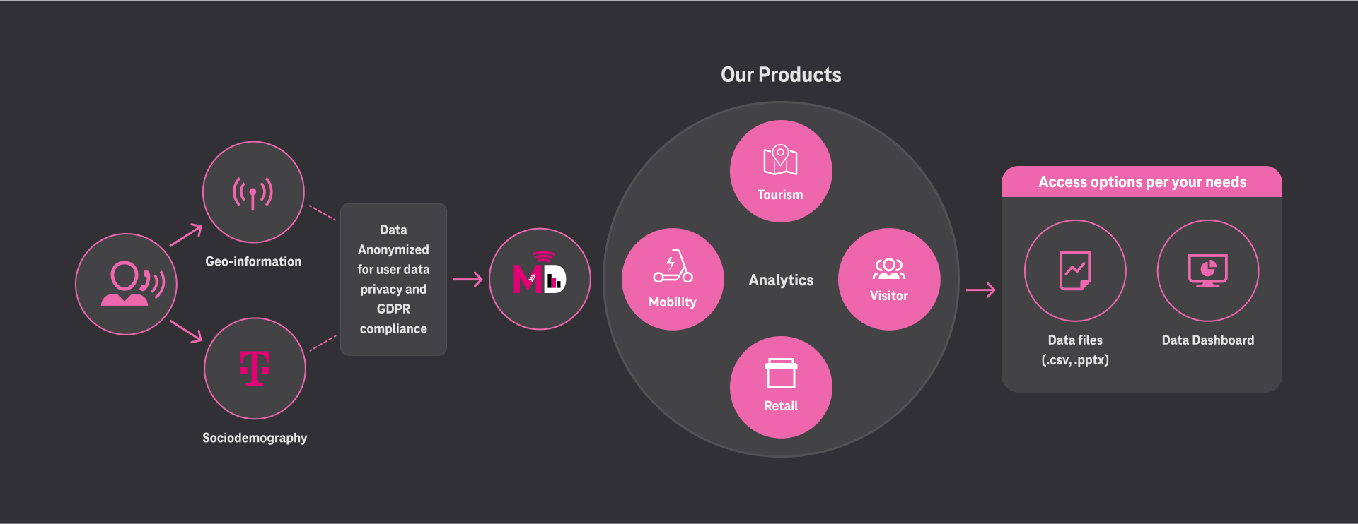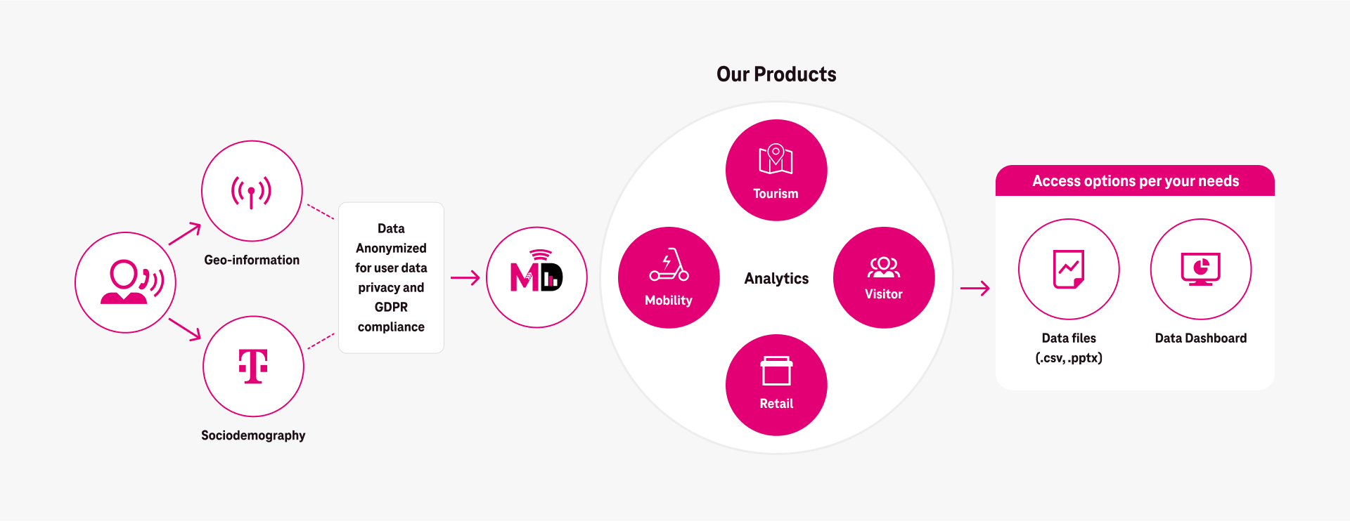 Bring the benefits of consumer analytics to your B2B applications. Gain deeper insights into value chains and improve services and productivity with data analytics from Motion Data, all based on anonymized data processing. Our technologies were developed in close collaboration with the German Federal Commissioner for Data Protection and Freedom of Information (BfDI) and have been examined and certified by external data protection inspection agencies.